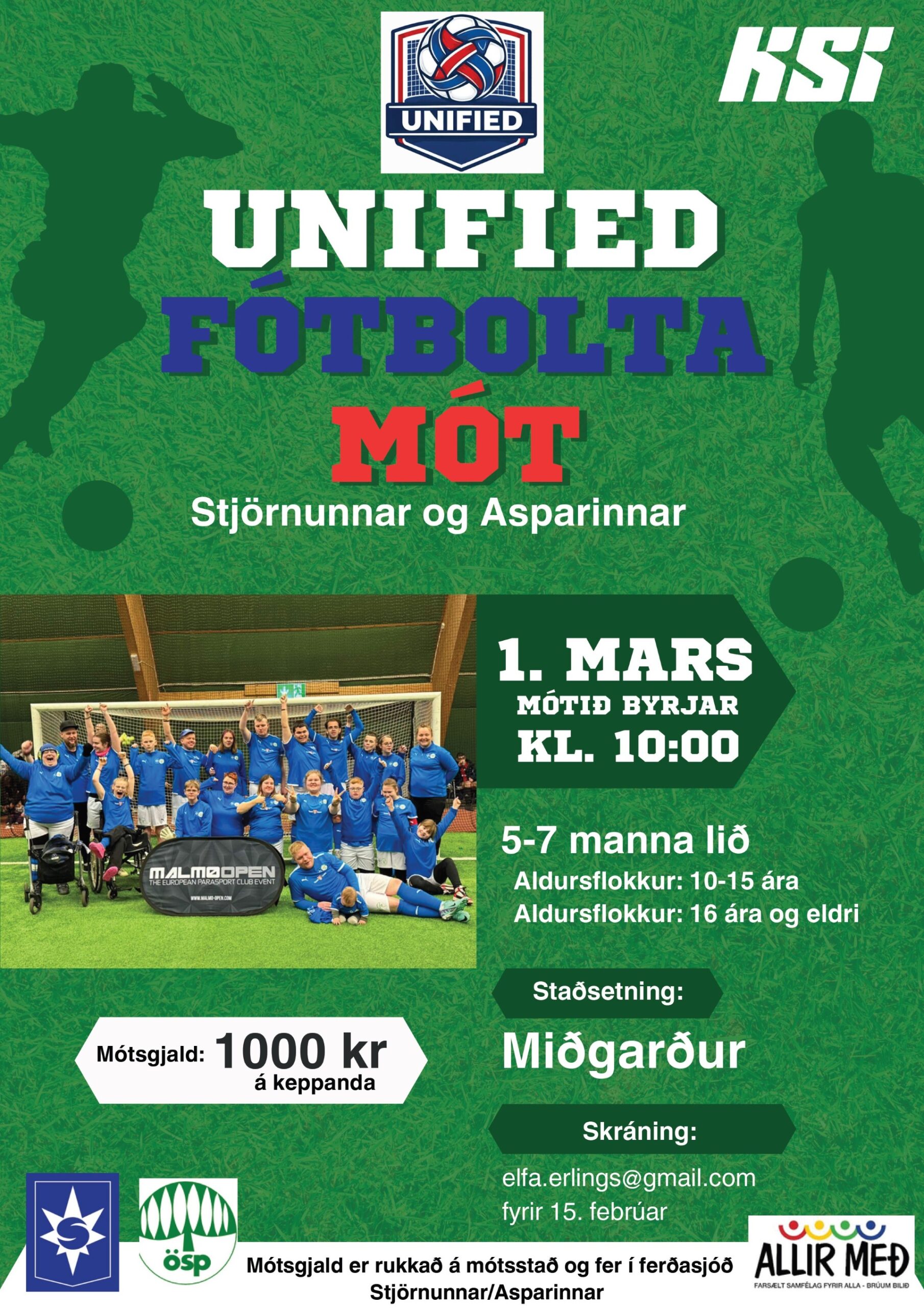 Unified leikar í fótbolta fara fram 1. mars næstkomandi í Miðgarði í Garðabær kl: 10:00. allar nánanir upplýsingar veitir Elfa á netfangið elfa.erlings@gmail.com Endilega kíkið á Unified leika í fótbolta....